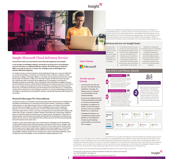 Lassen Sie sich von uns dabei unterstützen, digitale Herausforderungen zu meistern, wertvolle Zeit zurückzugewinnen und Produktivität, Effi-zienz und Innovation auf ein außergewöhnliches Niveau zu katapul-tieren. Unser Cloud Advisory Team ist Ihr Partner für die Bewertung und Transformation der Komplexität von Microsoft Cloud-Angeboten. Wir unterstützen Sie bei der erfolgreichen Umsetzung Ihrer Technologie-Roadmap und der Steigerung des ROI Ihrer Microsoft-Investitionen.